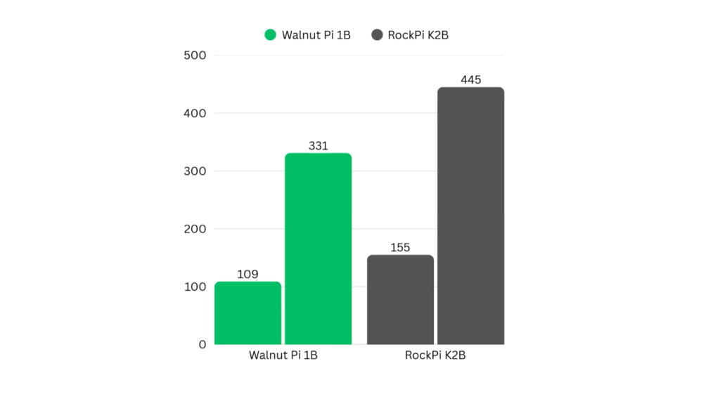 Very different and kind of upsetting numbers for Walnut Pi 1B. Cooling was same, sufficient, as well as the power source. OS was different, however I don’t think it was the reason. Ubuntu 22.04.5 build was used for RockPi K2B and XFCE Debian build for Walnut Pi 1B.